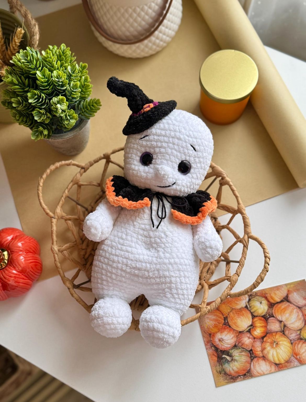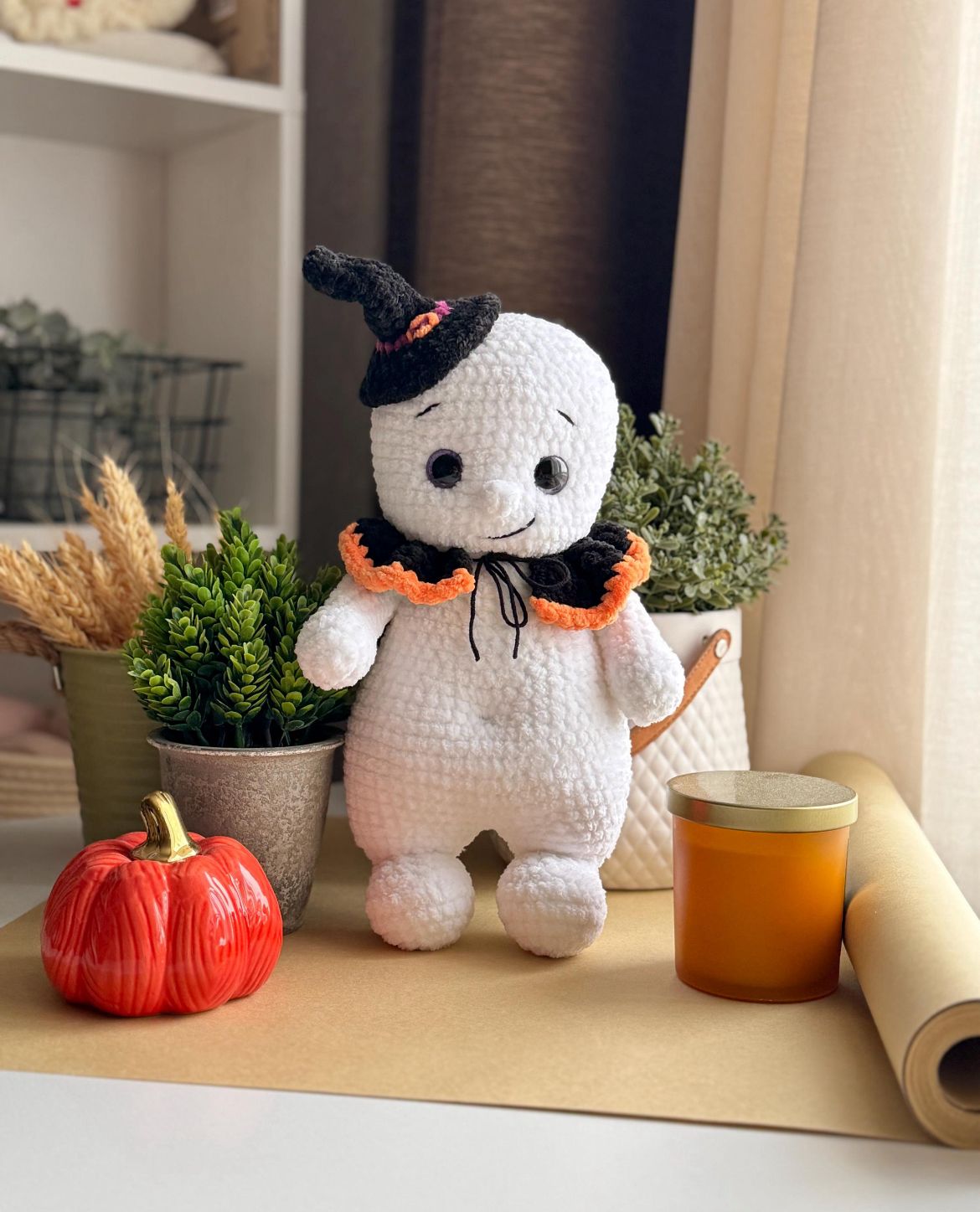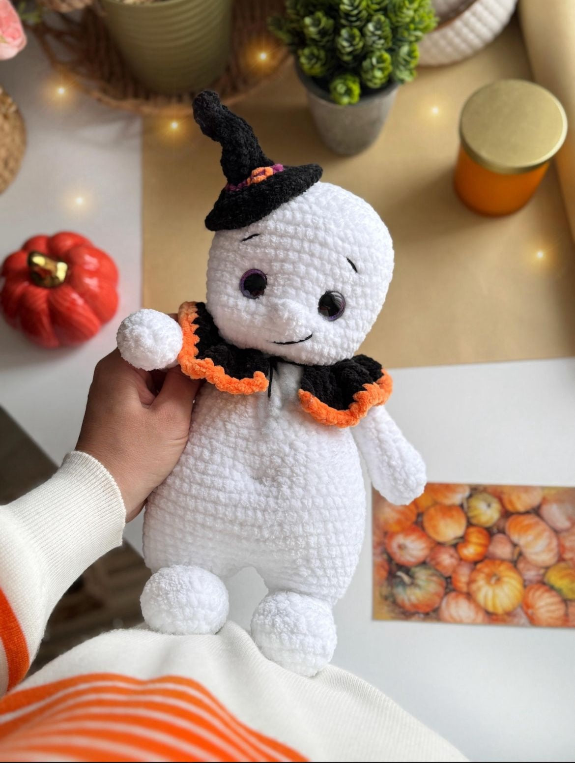 Ein originelles Häkelprojekt für alle Halloween-Fans – ein weiches, handgemachtes Gespenst mit passendem Hexenhut und Kragen. Perfekt als süße Deko oder als Geschenk mit Gruselflair.