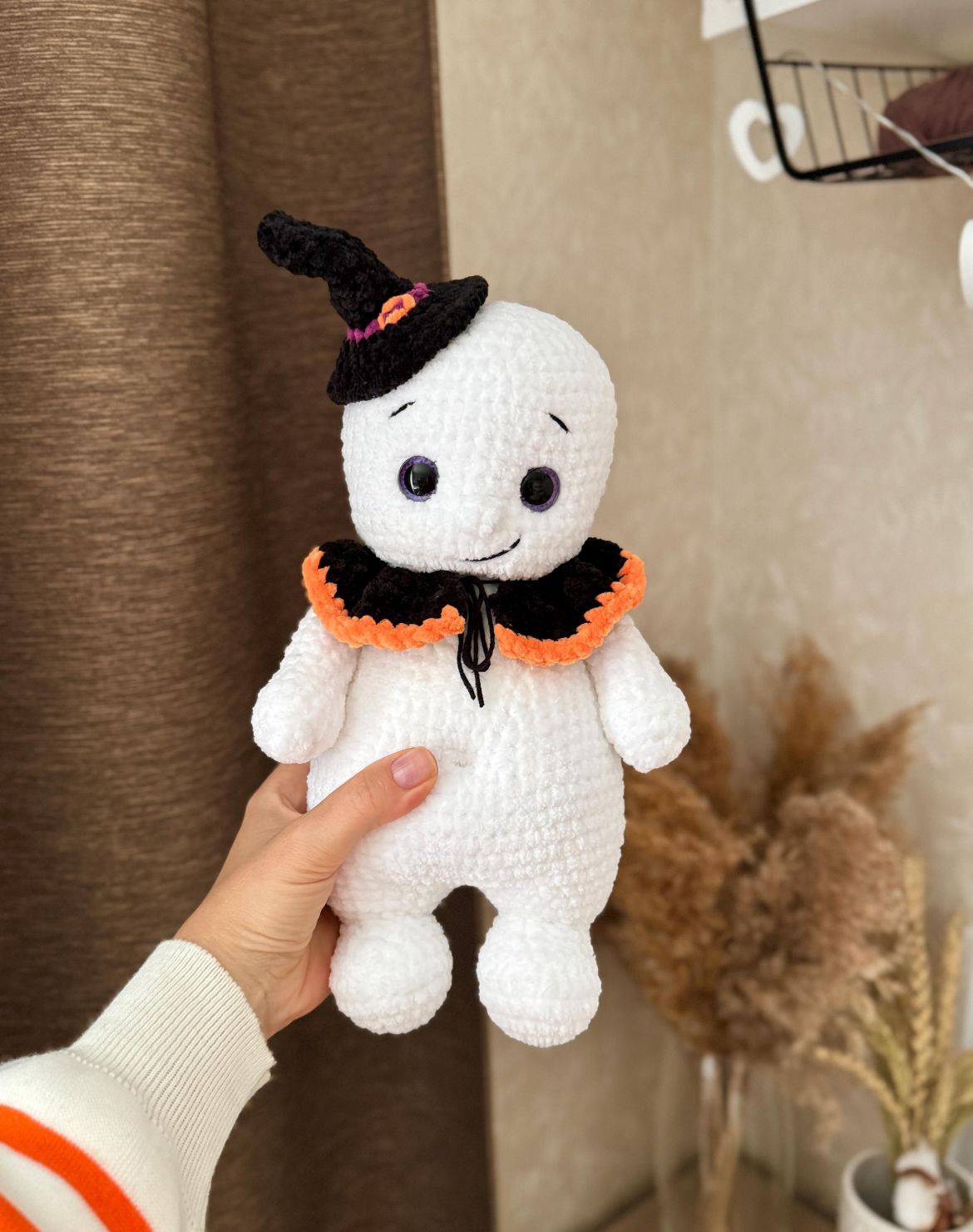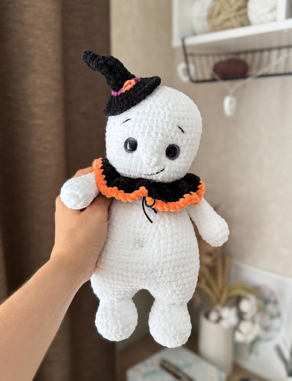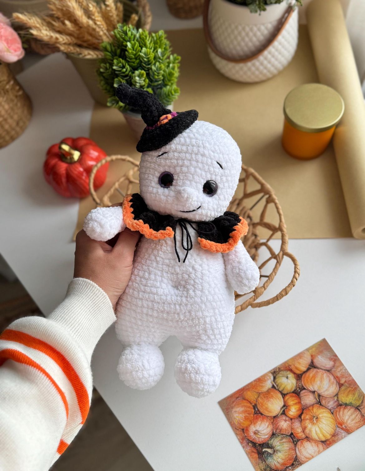 Ein originelles Häkelprojekt für alle Halloween-Fans – ein weiches, handgemachtes Gespenst mit passendem Hexenhut und Kragen. Perfekt als süße Deko oder als Geschenk mit Gruselflair.